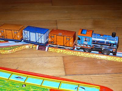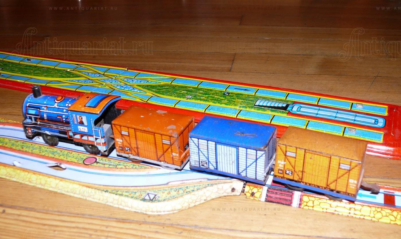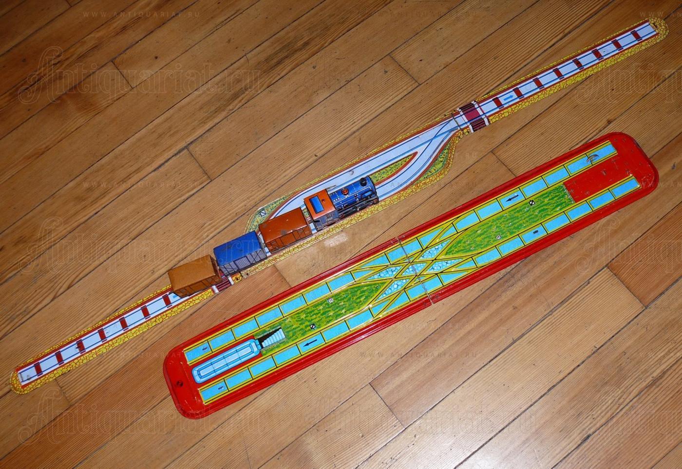 Заводной паровозик (ключ прилагается) и три вагона, в комплекте 2 складных железнодорожных полотна: из двух и трех секций.
