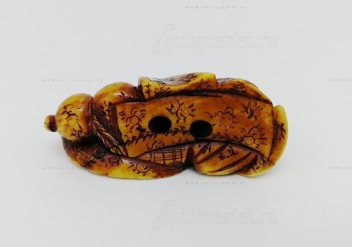Вид нецкэ - катабори (形彫). Выполнено в конце 18 - первой половине 19 века (эпоха Эдо) неизвестным автором. Работа выполнена методом резьбы из слоновой кости, для декоративного оформления использовалась техника "Кабори" (волосяная гравировка).