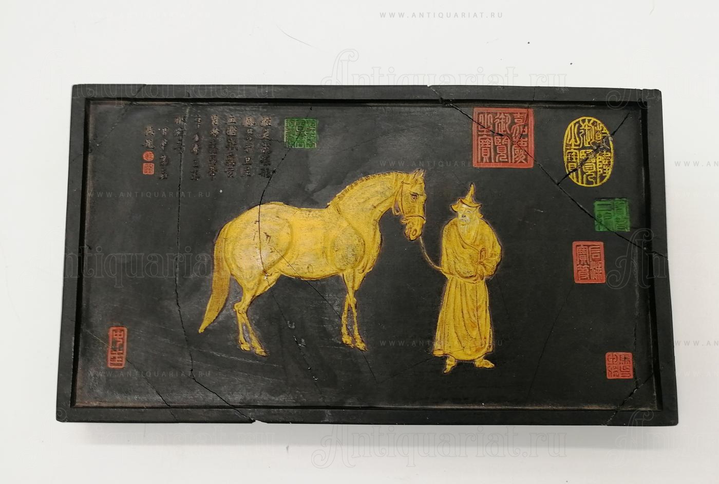 Представленный экземпляр украшен каллиграфией и традиционным изображением лошади и фигуры, что, вероятно, связано с традиционным китайским искусством и символикой. Такие изображения часто включались в бруски для туши для эстетических и символических целей, при этом каллиграфические печати (в красном) добавляют произведению искусства завершённость. На оборотной стороне изображена выгравированная надпись китайскими иероглифами, которая, вероятно, является примером каллиграфии или посвящением.