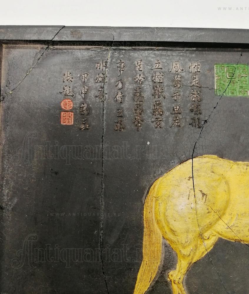 Клеймо или надпись с иероглифами «嘉慶年製», что означает «изготовлено в эпоху Цзяцин» династии Цин (1796–1820 годы). Это означает, что брусок для туши, вероятно, был изготовлен в этот исторический период.