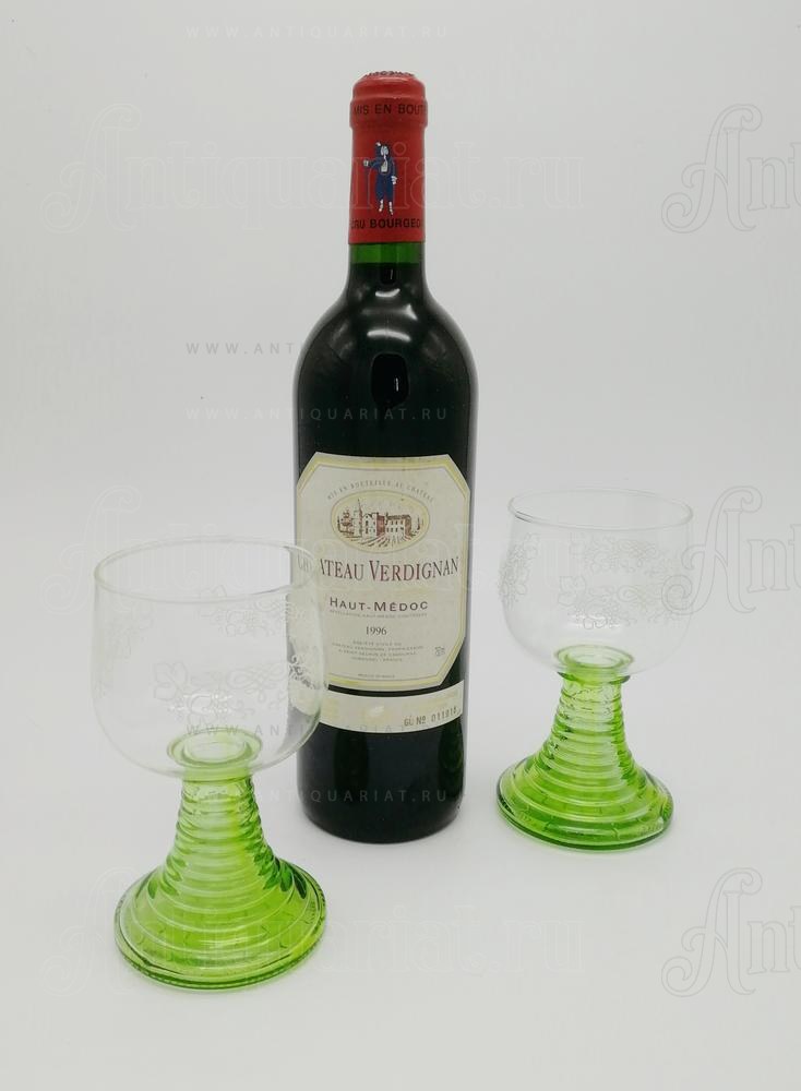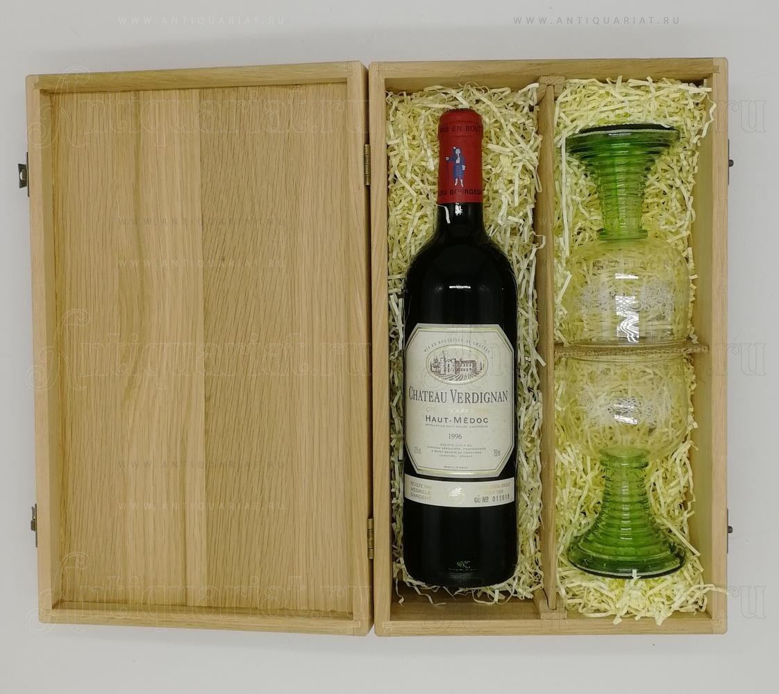 В набор входит бутылка вина "Chattau Verdignan" урожая 1996 года и пара "римских" бокалов для вина (рёмер, нем. Römer) нач. 20 века