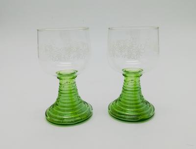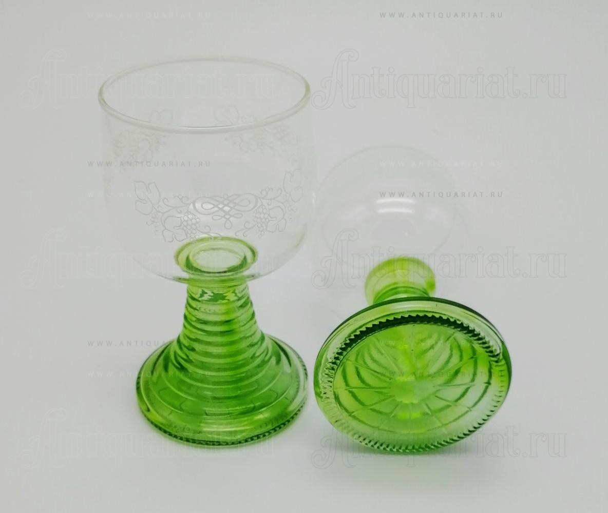 Входящие в комплект бокалы имеют высоту 14 см. с чашей диаметром 7,5 см. декорированной гравированным орнаментом с виноградной лозой. Бокалы в отличной сохранности.