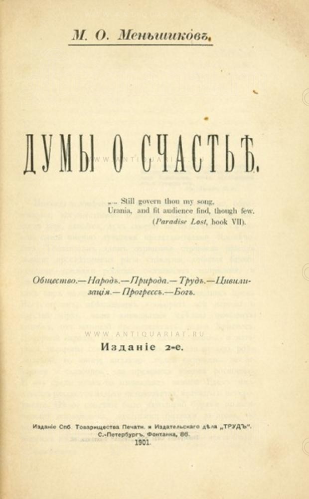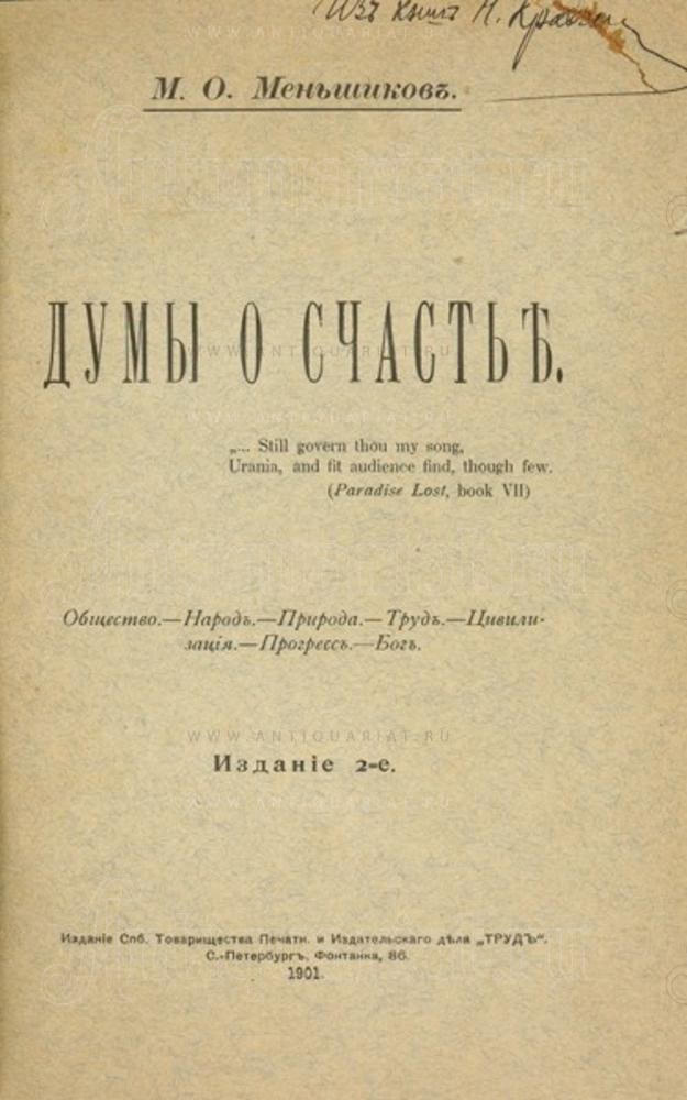 Меньшиков, М.О. Думы о счастье. СПб., 1901. 176 с.