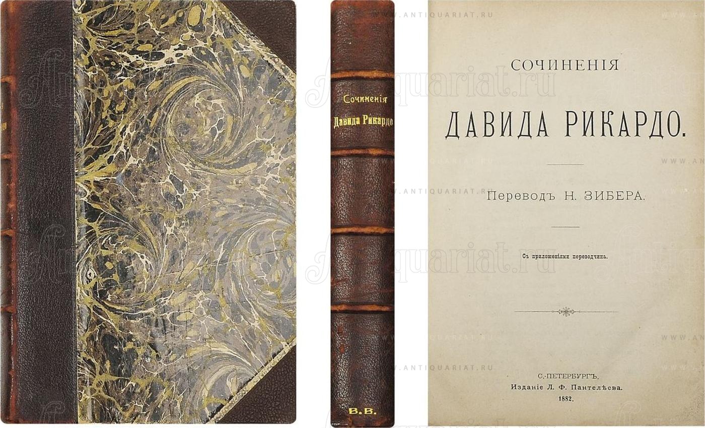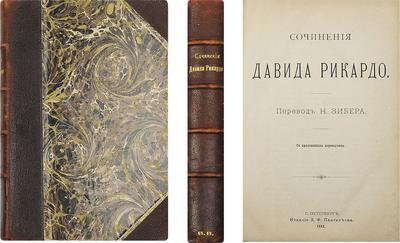 Пер. Н. Зибера. СПб.: изд. Л.Ф. Пантелеева; тип. М-ва путей сообщения, 1882. — [2], XX, III, 659 c. В добротном полукожаном переплёте эпохи. Бинтовой корешок, узорный обрез. Потёртости корешка, бумаги по краям крышек, надрывчик в нижней части корешка, незначительные фоксинги в начале блока, суперэкслибрис «В.В.» в нижней части корешка, пометы синим карандашом на с. 600-606, 624. Труды английского экономиста, классика политической экономии Давида Рикардо (1772-1823). В приложении выдержки из сочинений Карла Маркса и Томаса Тука, имеющие отношение к теориям Рикардо.