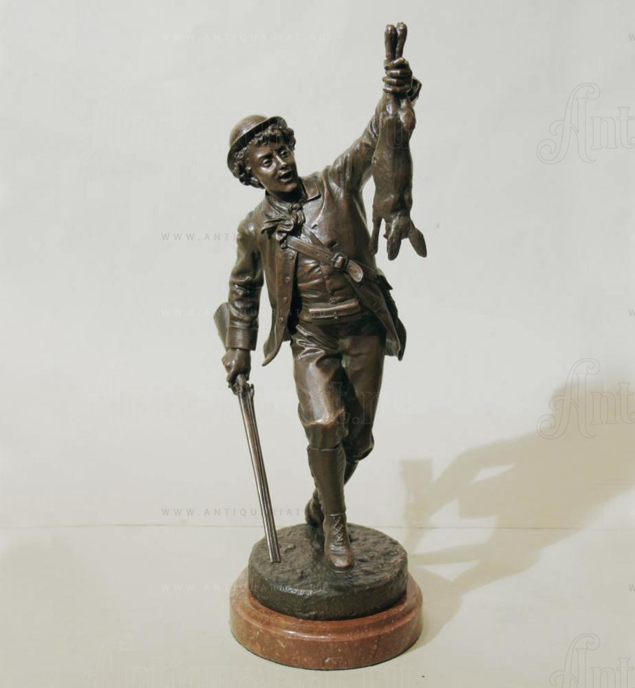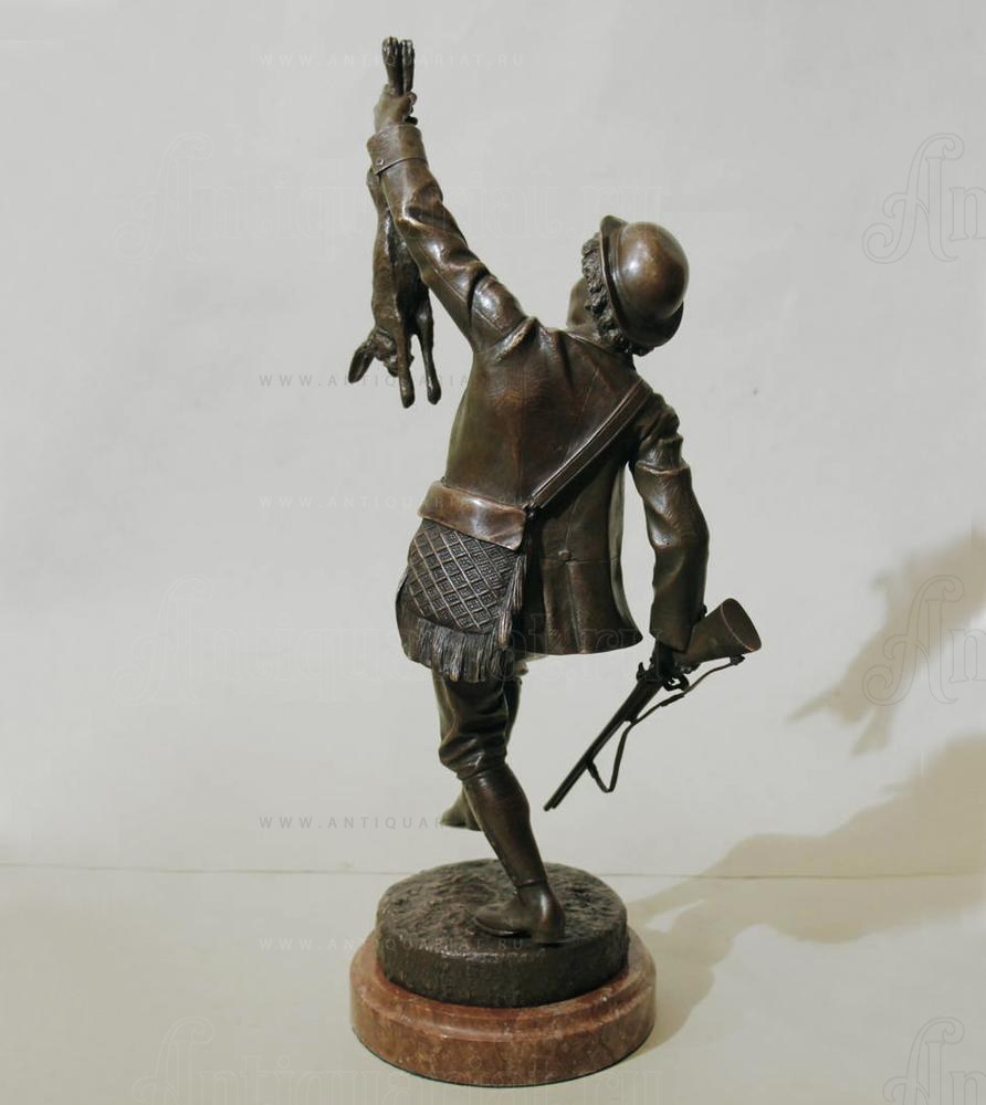 Изображен счастливый охотник несущий свою добычу - зайца. Незатейливый сюжет скульптуры выполнен с высоким качеством. Автором хорошо переданы динамика и эмоции охотника.