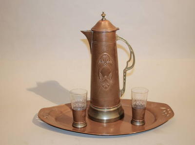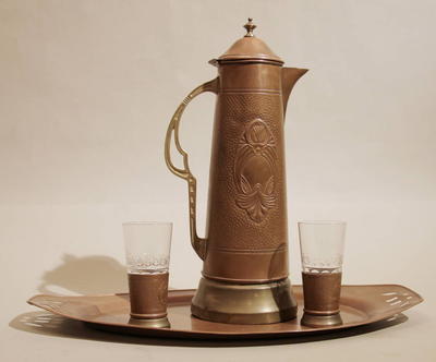 В наборе для напитков: кувшин, два подстаканника со стеклянными стаканчиками и поднос, выполненные из чеканной меди, на бронзовых основаниях.