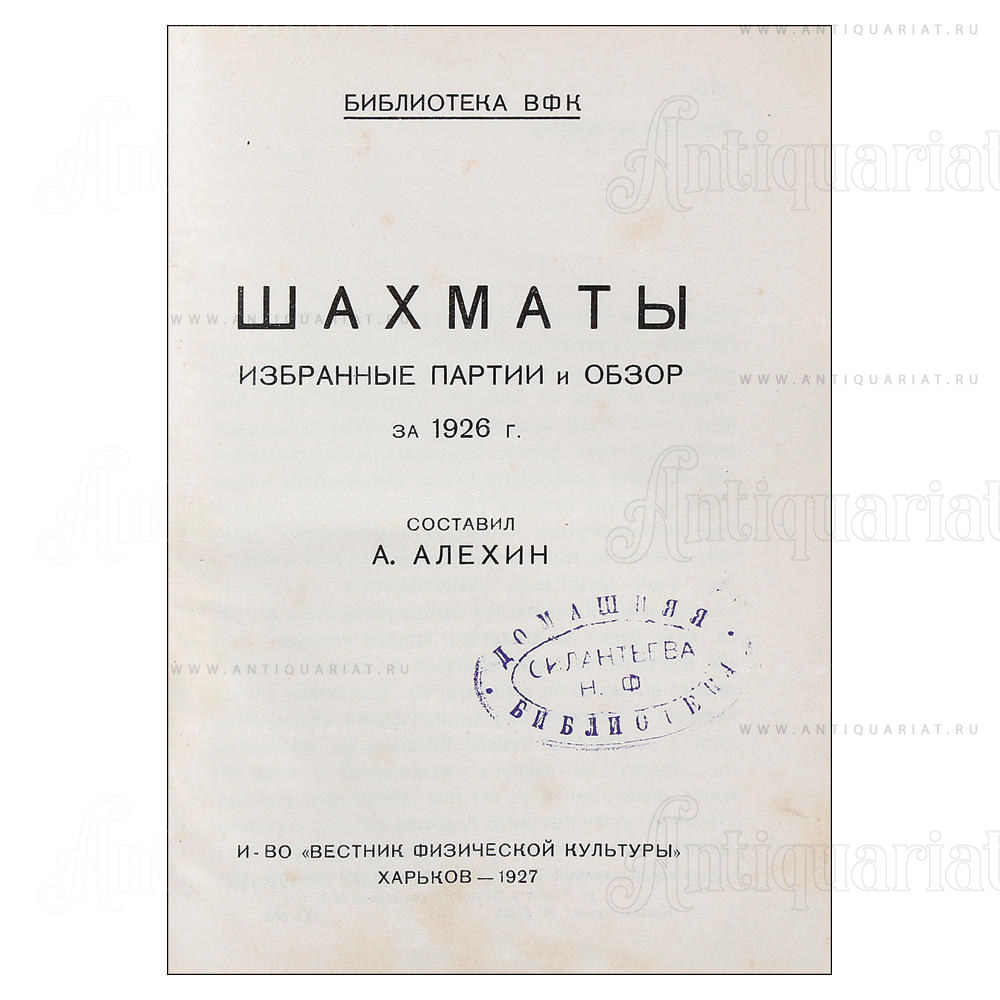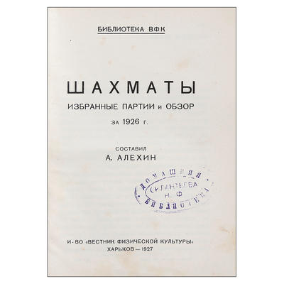 Шахматы. Избранные партии и обзор за 1926 г. / Составил А. Алехин. — Харьков: И-во Вестник физической культуры, 1927.