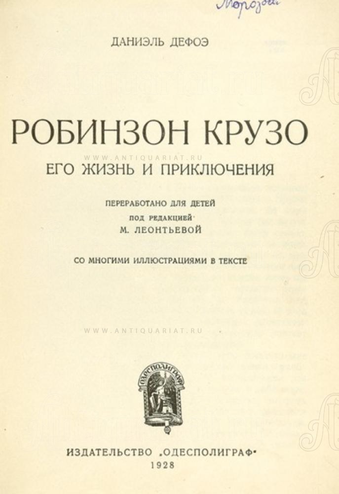 Дефо, Д. Робинзон Крузо. Его жизнь и приключения / перераб. под ред. М. Леонтьевой. Одесса: Издательство «Одесполиграф», 1928. 1 л. фронт., 210, [2] с., ил.