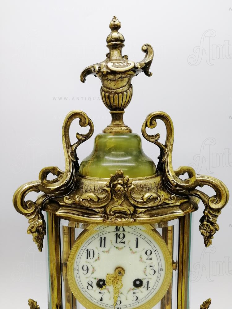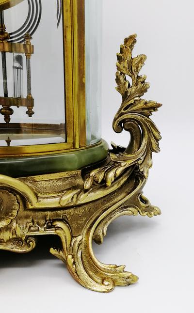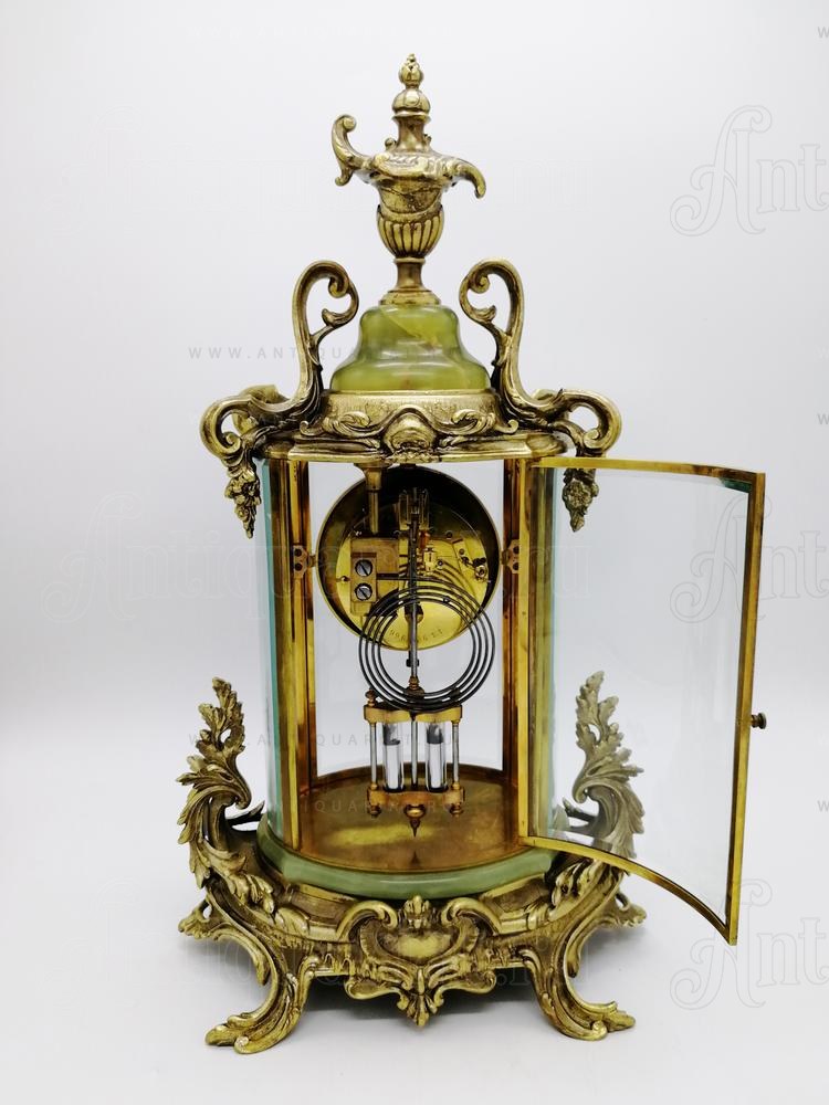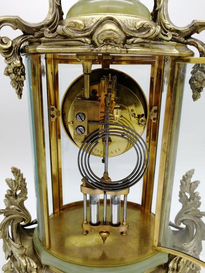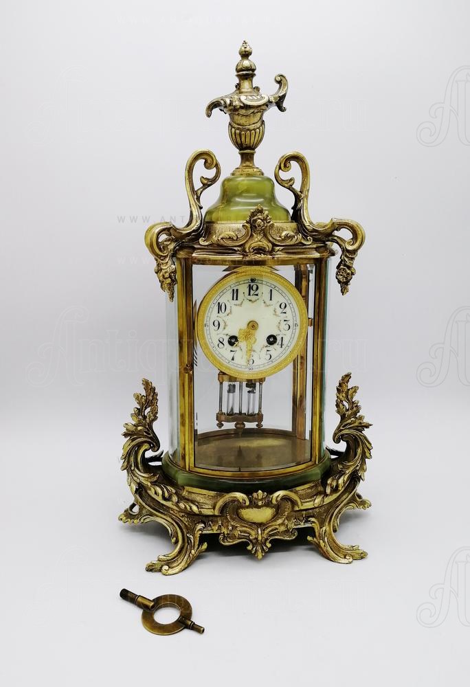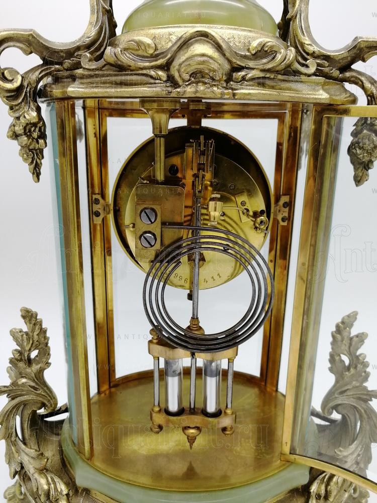 Часы с раздельным ключевым заводом, имеют часовой и получасовой бой. Декор выполнен в стиле ампир из бронзированного метала и вставок из оникса. Механизм размещён за выпуклыми стеклами с фацетом. Маятник ртутный. Завод двухнедельный.