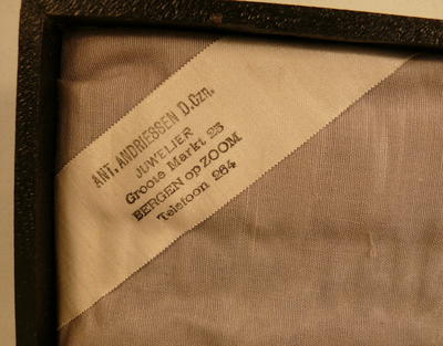 Надпись на ленточке в углу футляра "ANT. ANDRIESSEN D. Czn. JUWELIER, Groote Markt, 22, Bergen op Zoom, telephone 264".