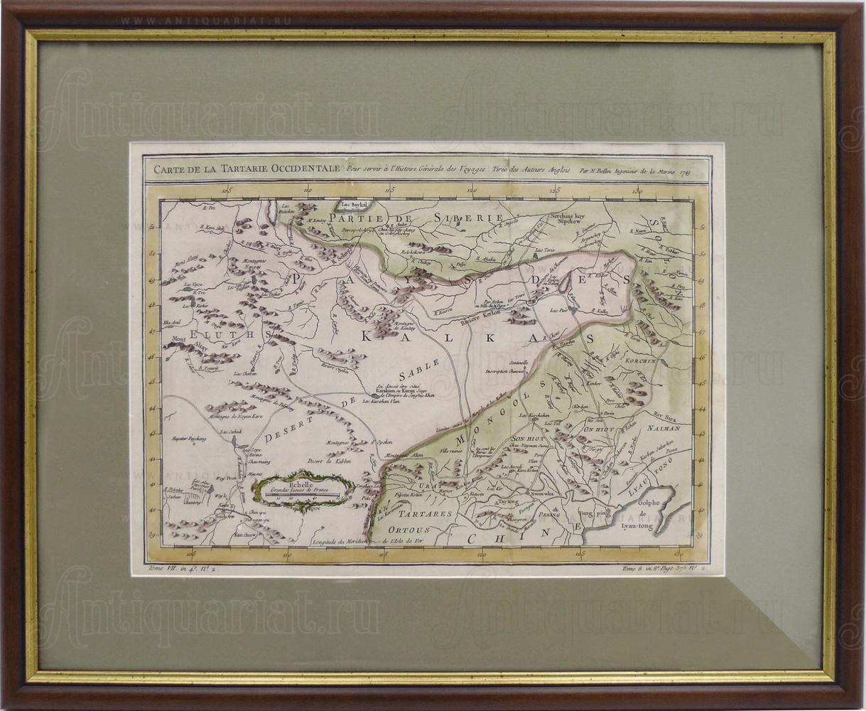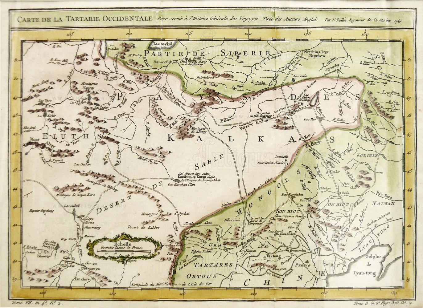 Карта дает очень подробное представление о Тартарском регионе России. Основана на исследованиях иезуитов, картографии Ивана Кирилова и английских картах региона. Карта охватывает западную часть Тартарии с упором на регион современной Монголии - ранее «Страны халхасов» (Халха-монголы, Pays des Kalkas). Включает информацию из важных исследований Кирилова этого отдаленного региона в дополнение к иезуитским и английским источникам. На ней подробно описаны дороги и показаны участки Великой стены, вверху карты часть озера Байкал.