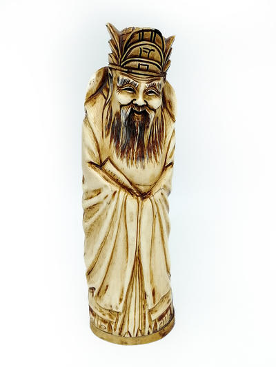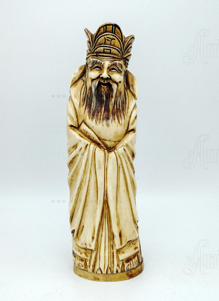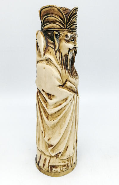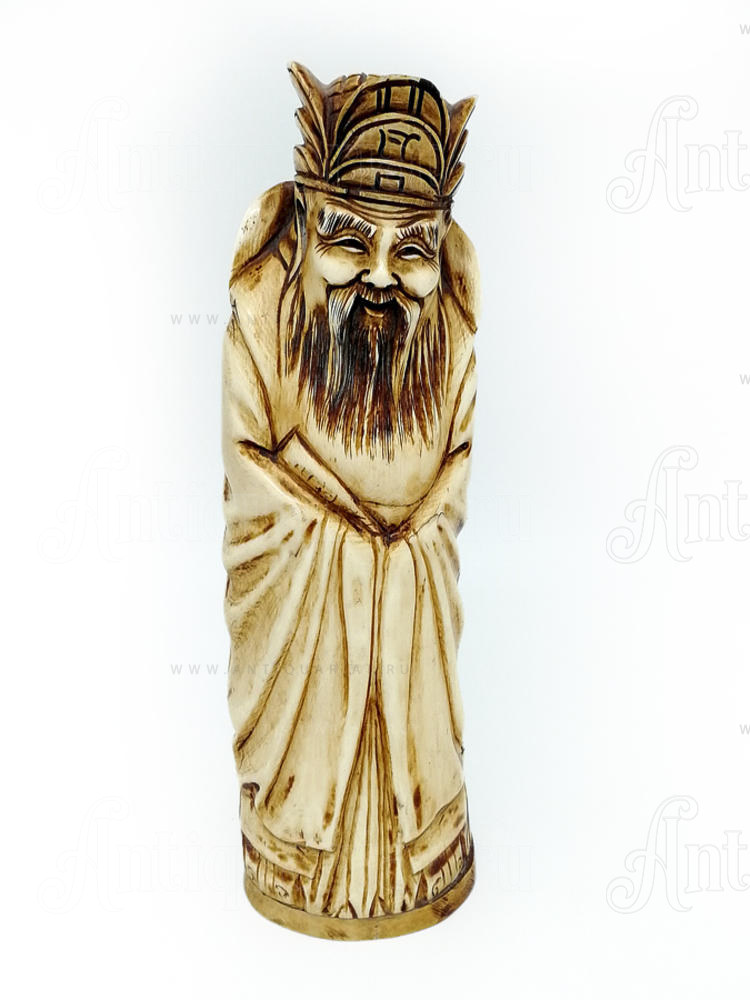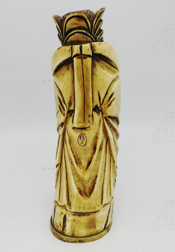 Представленная статуэтка, вырезанная из бивня слона, изображает китайского императора Юнчжэна (правление 1722–1735 гг.), держащего в руках дщицу (доску) для письма. На обратной стороне фигуры выгравированы иероглифы 雍正 ("Yongzheng Emperor" - Иператор Юнчжен). , что подтверждает принадлежность изображенного персонажа. Эта работа относится к категории шоукэ 手刻 — статуэток из кости, которые были популярны в Китае в XVIII-XIX веках и являются аналогом японских окимоно.Шоукэ, появившиеся задолго до окимоно, занимают особое место в китайском декоративно-прикладном искусстве. Они часто изображали императоров, божеств и других значимых фигур, отражая культурные и исторические аспекты китайской цивилизации. В данном случае статуэтка передает не только визуальный облик императора Юнчжэна, но и символизирует его связь с культурными и административными аспектами правления, что подчеркивается дщицей для письма, символизирующей мудрость и управление.Японская культура, развиваясь под влиянием Китая, переняла многие художественные традиции, включая резьбу по кости. Шоукэ стали прообразом для японских окимоно, которые появились позже и стали важным элементом японского декоративного искусства. Эта статуэтка, представляющая собой шоукэ, является уникальным произведением, которое не только отражает мастерство резчика, но и несет в себе глубокий символизм и культурную значимость. Ее подлинность и историческая ценность делают ее ценным приобретением для коллекционеров и знатоков антиквариата.