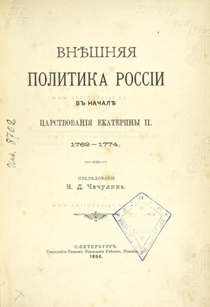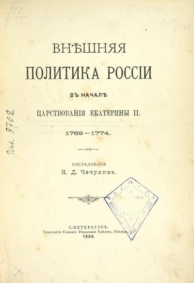 Чечулин, Н.Д. Внешняя политика России в начале царствования Екатерины II. 1762-1774. СПб.: Тип. Главного упр. уделов, 1896. [4], VII, 468, IV с.