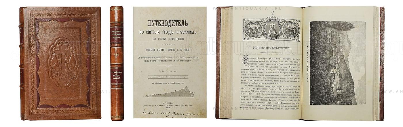 В цельнокожаном индивидуальном переплёте конца ХХ века. Мелкие фоксинги, влад. надпись на тит. л. Приплёт: Путеводитель по св. Афонской горе и указатель ее святынь и прочих достопамятностей; с 31 видом монастырей, скитов и картою Афона. — 8-е изд. М.: изд. Афонск. рус. Пантелеймонова монастыря, 1903. — 238, II с.: ил. Лицевая издательская иллюстрированная обложка сохранена