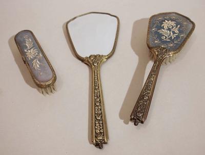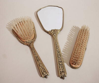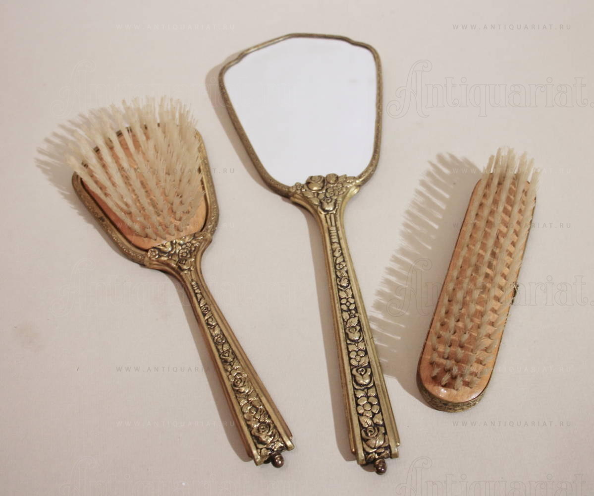 Набор состоит из трех предметов: щетка для волос, зеркало, щетка для одежды.