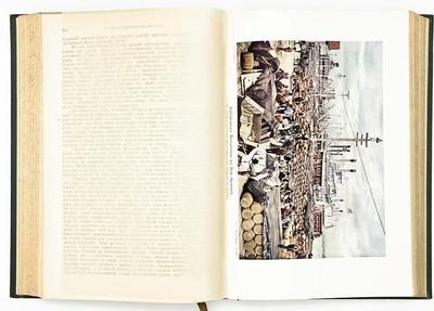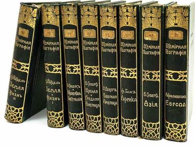 Каждый том в составном издательском переплёте. Крышки обтянуты зелёным коленкором. На передней крышке тиснение чёрной крас-кой: имя автора и название книги. Корешок из чёрной кожи. На корешке тиснение золотом: мотивы геометрического и растительного орнаментов, название серии, имя автора и название издания. Составные форзацы из белой бумаги, имитирующей муар. «Мраморные» обрезы. Отличная сохранность. Незначительные потёртости переплётов, с. 513–528 ошибочно вплетены между с. 496 и 497и нет оглавл. (кн. 7: Ратцель, Ф. Земля и жизнь, т. 2), без рекламы в каждой книге, шт. бук. маг.