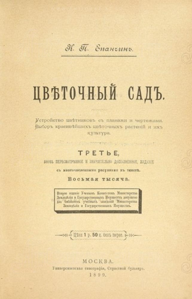Устройство цветников с планами и чертежами. Выбор красивейших цветочных растений и их культуры. 3-е изд., вновь пересм. и значит. доп. М.: Унив. тип., 1899. [4], 265 с., ил.