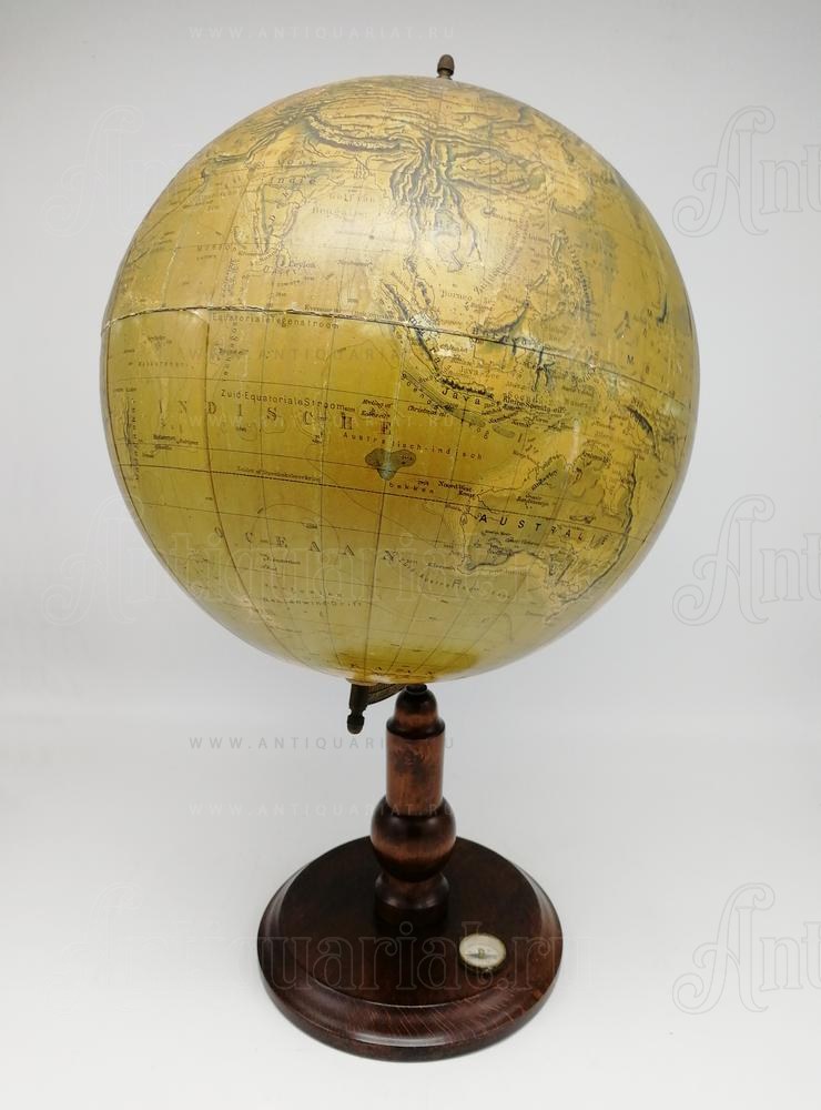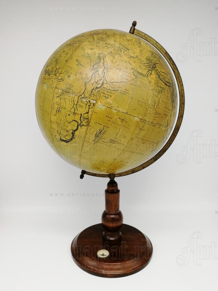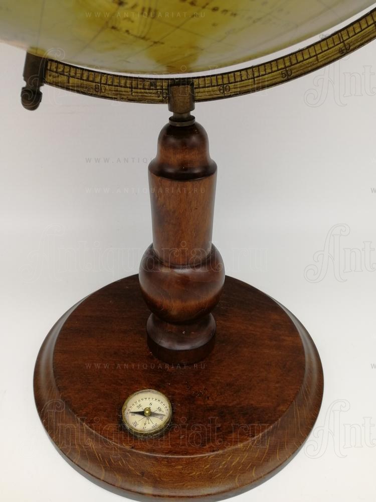 На глобусе кроме общегеографической, также нанесена карта рельефа поверхности Земли. Подставка и сфера выполнены из дерева. В основание подставки вмонтирован компас (диаметр 30 мм) . Изображение имеет незначительные потертости характерные возрасту предмета.