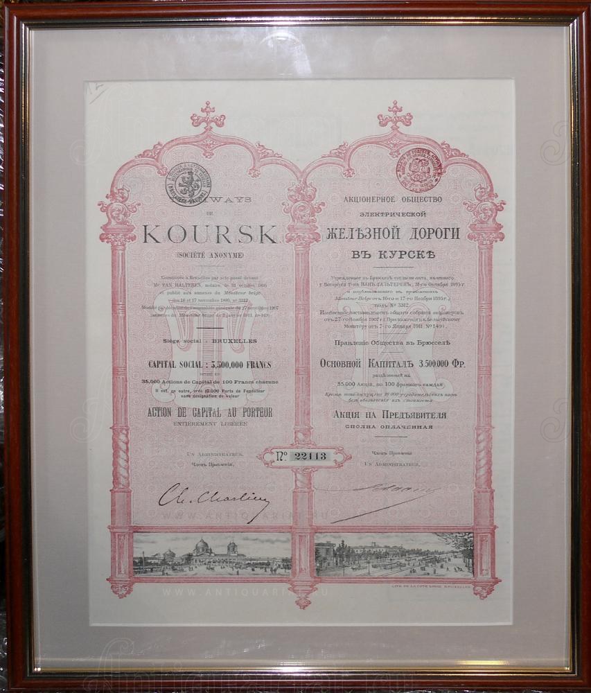 Акция № 22113 в 100 франков, на предъявителя, сполна оплаченная, Акционерного общества электрической железной дороги в Курске.