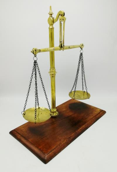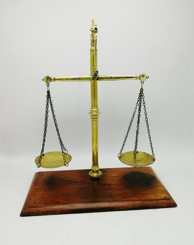 Равноплечие коромысловые весы с подвесными чашками из латуни на подставке орехового дерева.
