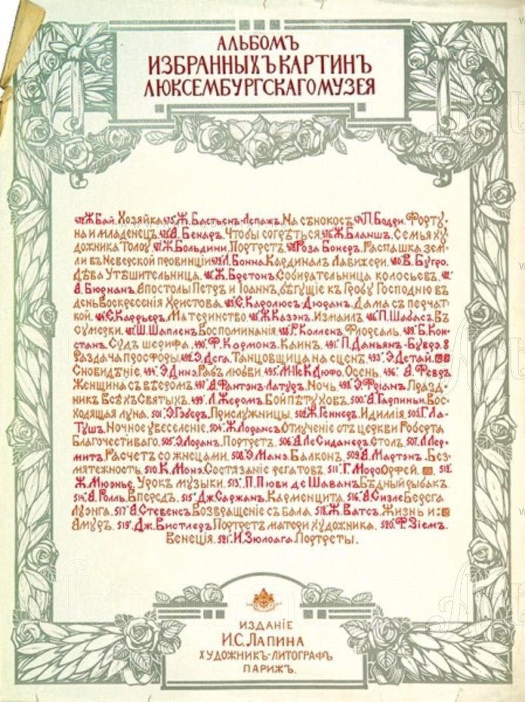 [О лучших французских художниках] Париж: Издание И.С. Лапина, художник-литограф; Тип. «Герольд» (СПб.), [1907-1914]. 1 загл. л., 22 с., [49] л. текст, 49 л. ил. (утрачены №№ 507 и 510; л. № 477 в двух экз.).