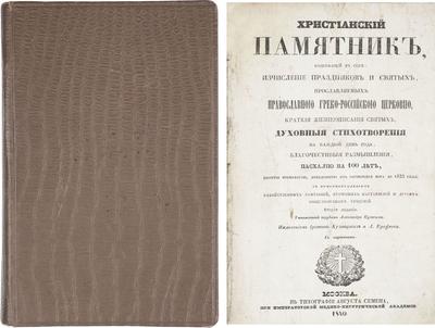 Христианский памятник, содержащий в себе: исчисление праздников и святых, прославляемых православной греко-российской церковью, краткие жизнеописания святых, духовные стихотворения на каждый день года, благочестивые размышления, пасхалию на 100 лет, полную хронологию, доведенную от сотворения мира до 1833 года; с присовокуплением хозяйственных замечаний, врачебных наставлений и других общеполезных сведений; 2-е изд / умнож. трудами Александра Кузнецова; иждивением братьев Кузнецовых и А. Ерофеева. М.: В тип. Августа Семена при Имп. Медико-хирургической академии, 1840. — [2], 595, Х с., 1 л.фронт., 11 л. ил.; 24x15,5 см.