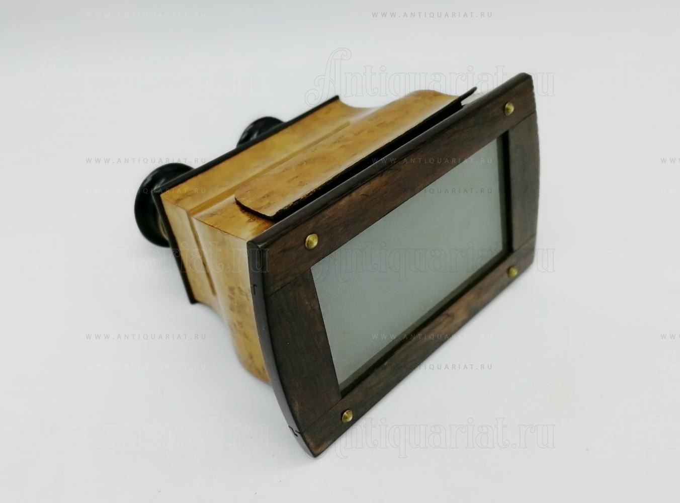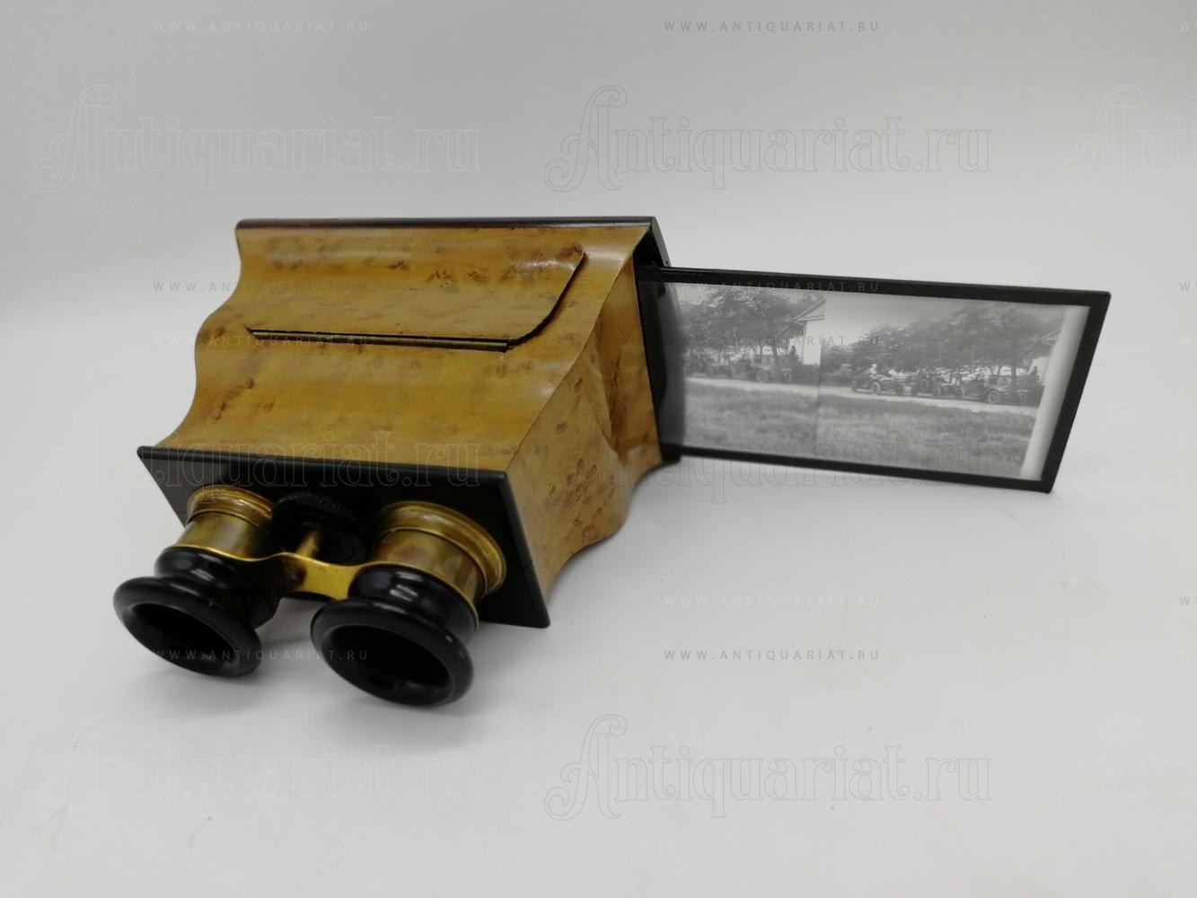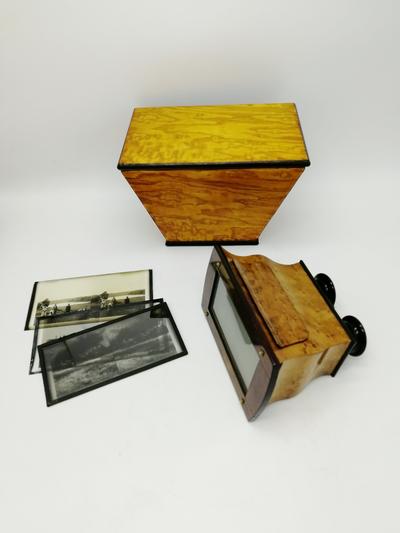 Облицован древесиной клёна "птичий глаз", отделка шелаком. Оптика чистая (без замутнений). В комплекте кейс для хранения прибора и три стереопары на стекле.