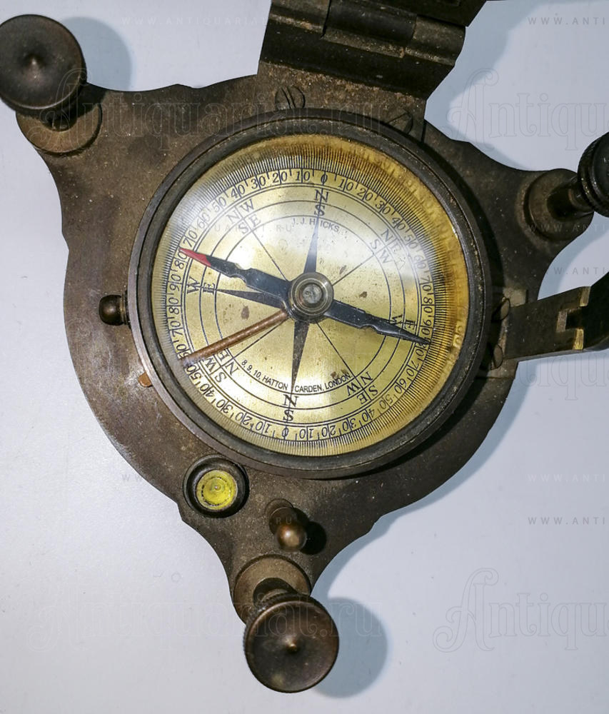 Изготовлен английской фирмой "J. J. Hicks" - на футляре и компасе есть маркировки "HATTON GARDEN / LONDON", "J.J. Hicks", "8,9,10 HATTON GRADEN,LONDON". На верхней крышке закреплена таблица корректировки показаний, выполненная на медной пластине методом гравировки.