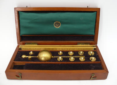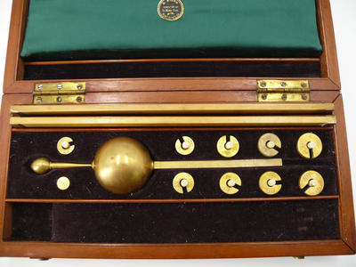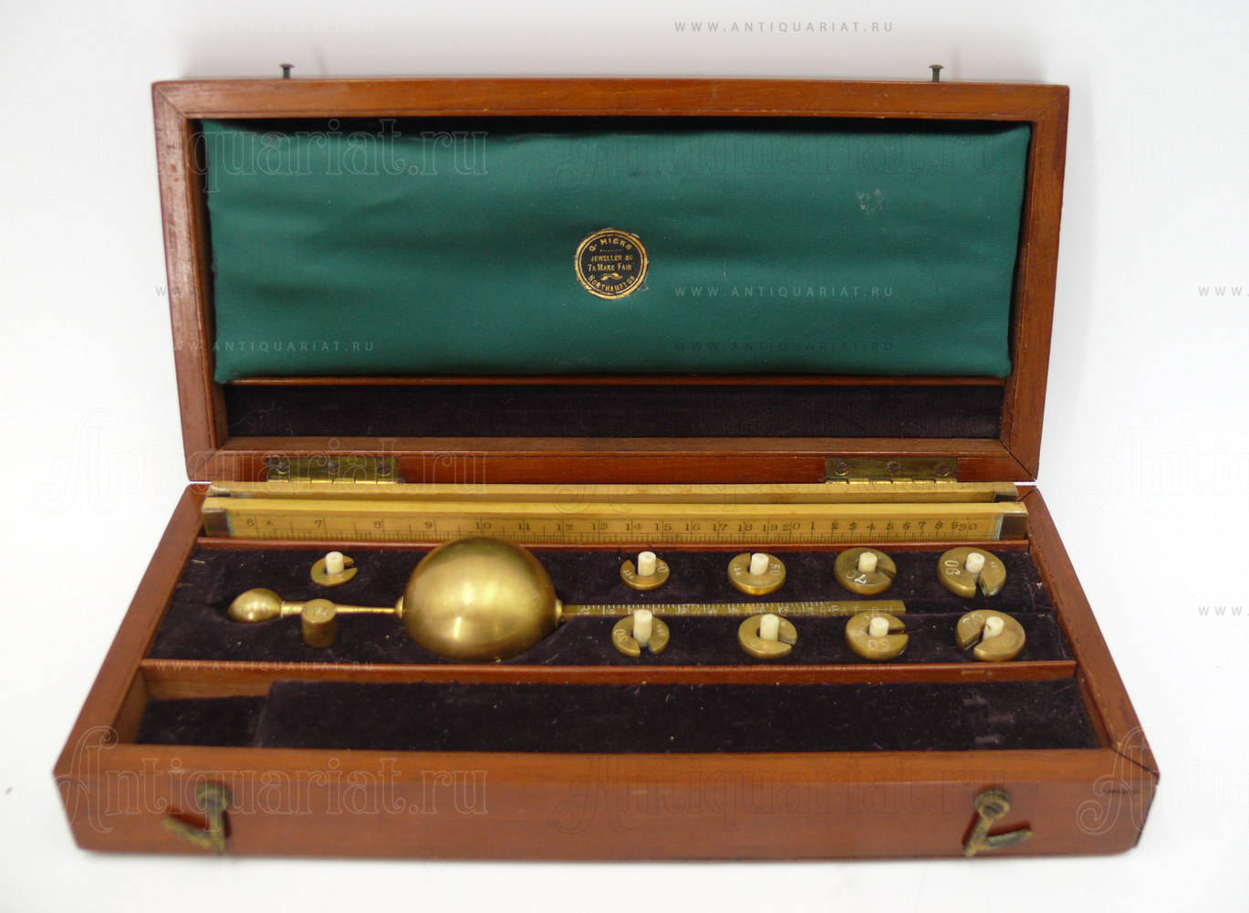 Прибор конца 19-го века изготовленный Томасом Блейком (Thomas Odempsey Blake , 57 Hatton Garden, London). Все веса и поплавок ареометра индивидуально маркированы, доказывая, что комплект является оригинальным и полным.