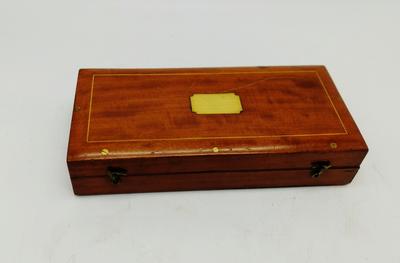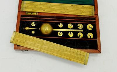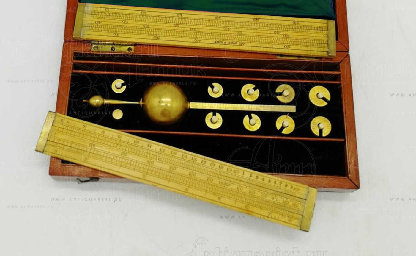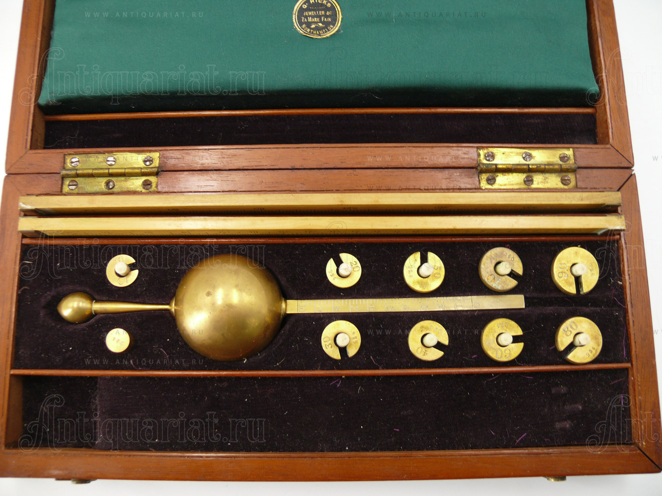 Прибор в оригинальном инкрустированном футляре красного дерева. В набор входит Полный комплект оригинальных разновесов и две линейки для вычисления плотности различных материалов. Порядковый номер прибора 954. Указаны размеры футляра.