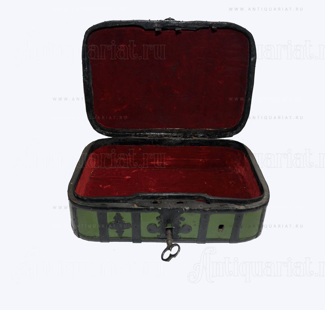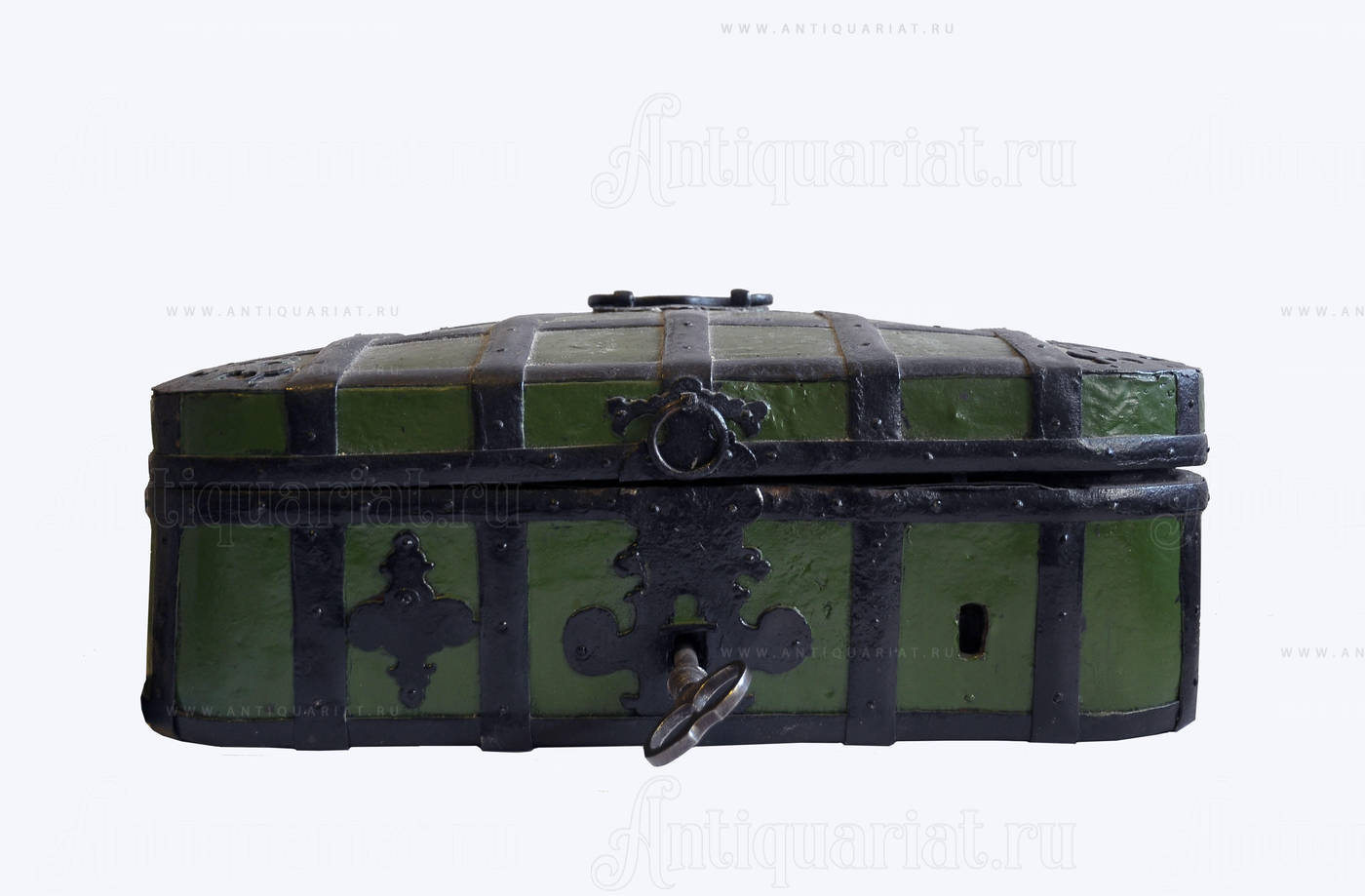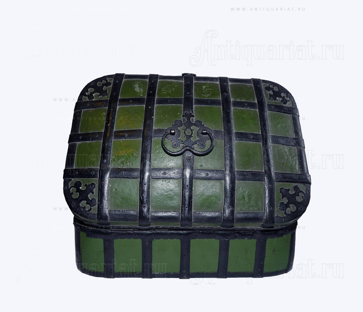 Массивный сундук (денежный ящик) - для перевозки и хранения денег и прочих ценностей изготовлен на рубеже XVIII-XIX веков в России. Корпус сундука из дерева обшитого металлом, внутри - отделка из красного бархата, для удобства переноски имеется ручка. Замок сундука с секретом, в полностью рабочем состоянии.