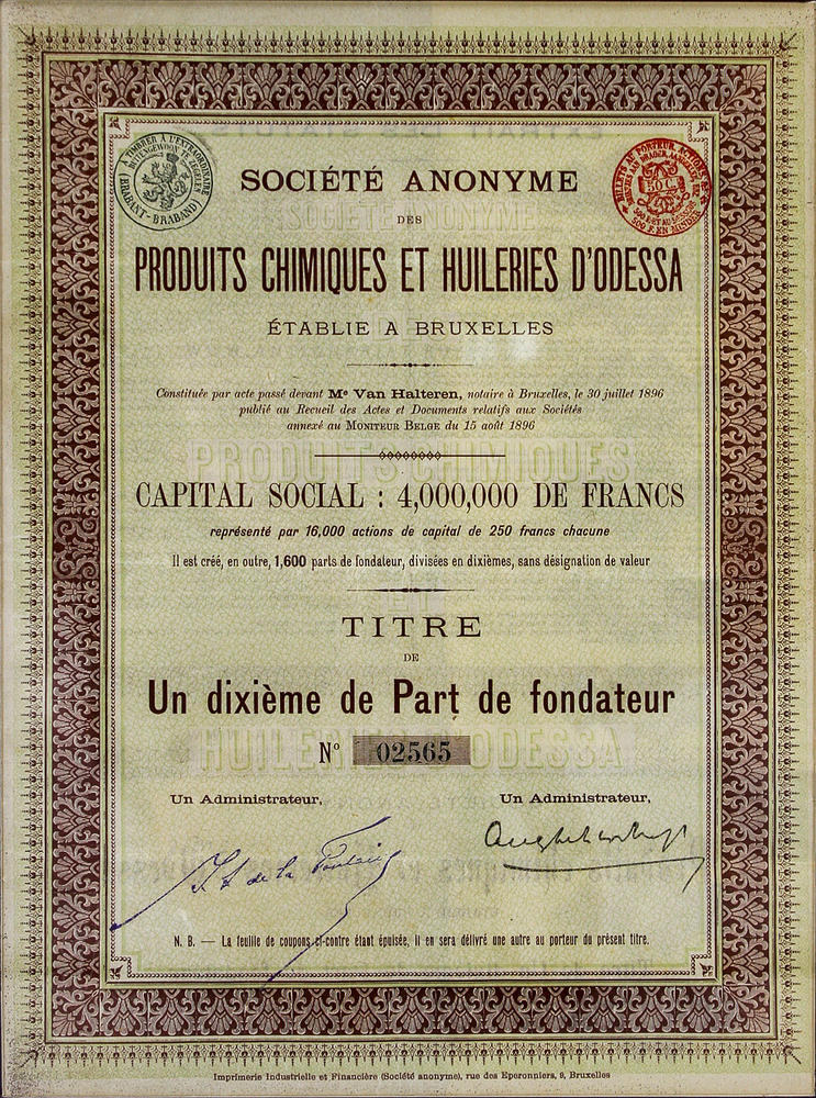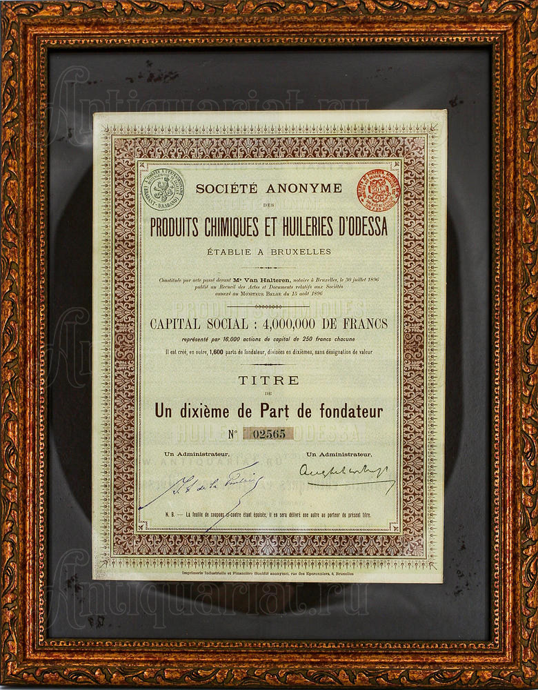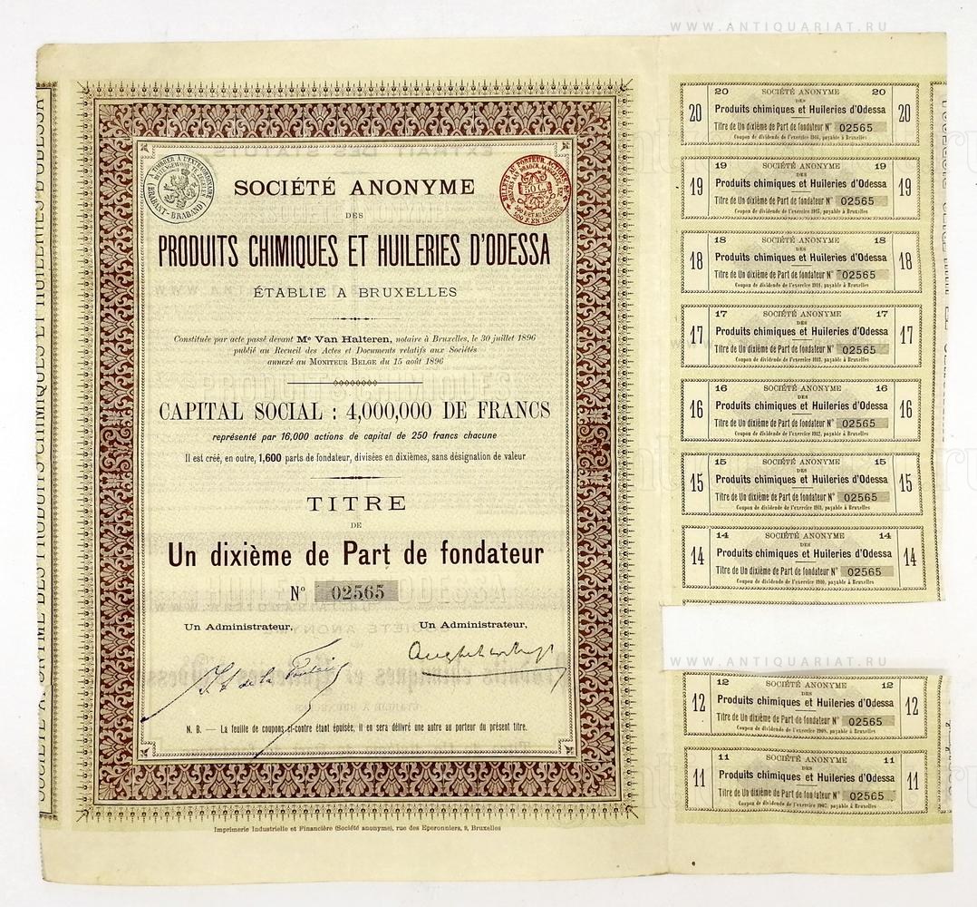 "Societe anonyme des Produits Chimiques et Huileries d'Odessa. Titre de Un Dixieme de Part de fondateur. Bruxelles, 1896"