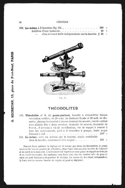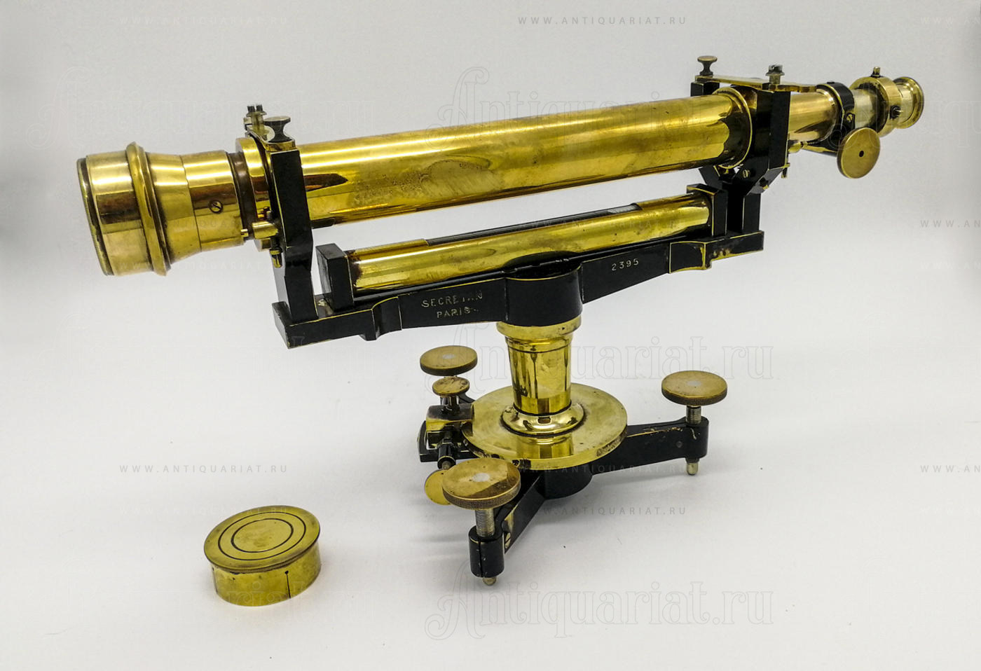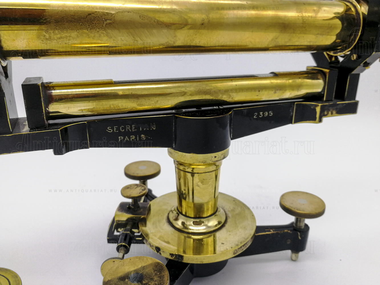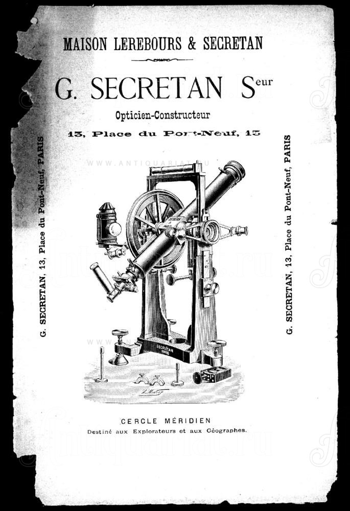 Это инструмент французского происхождения, подписанный "Secrétan à Paris". Секретан (Secrétan) был профессором оптики в Лозанне, работал в Парижской обсерватории до 1848 года. Первоначально фирма была основана в Париже в 1789 году Ноэлем Жаном Леребуром (Noël Jean Lerebours) на набережной Орлоге, 69. Он работал с Ноэлем-Мари-Паймелем Леребурсом, сыном Ноэля Жана Леребурса (1761-1840), в Париже с 1845 по 1855 год и сам после этого под маркой "Opticien de S.A.M. l'Empereur". В 1855 фирма "Secrétan" была переименована в "Maison Lerebours & Secretan", в которой Секретану помогали его сын Огюст (Auguste) и племянник Джорж (Georges) Secrétan.