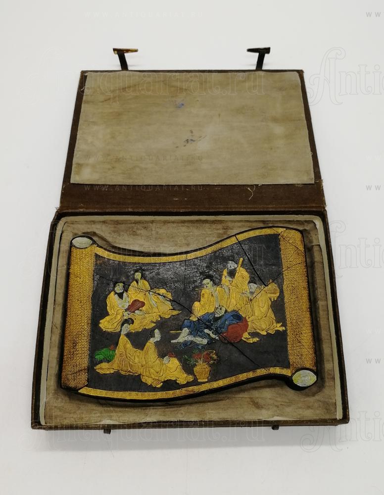 На лицевой стороне изображена сцена с учёными/мудрецами — типичный сюжет в китайской культуре: