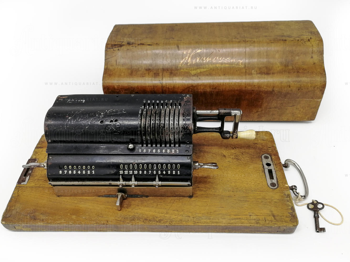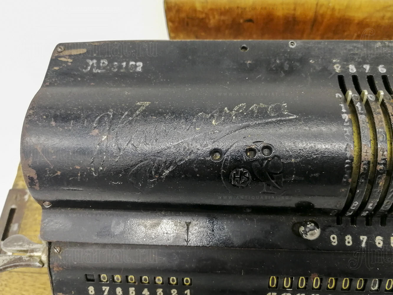 Счетная машина изготовлена фирмой Hannovera Rechenmaschinenfabrik, Oventrop, Heutelbeck und Co., в немецком городе Пайн (недалеко от Ганновера) в 1923-1925 годах. Это самая первая модель "Model A / AK". Серийный номер 3162.