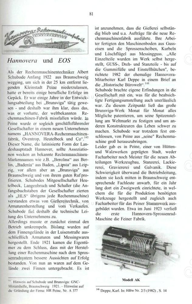 Он проработал в отделе разработок «Брунсвиги» несколько лет, и поэтому ему было ясно, что то, что он планировал, вызовет недовольство всемирно известного завода счетных машин. В Фейне он сразу стал управляющим партнером в новой компании под названием «HANNOVERA- Rechenmaschinenfabrik, Oventrop, Heutelbeck and Co» . Это название, латинизированная форма столицы штата Ганновер, должно пробудить ассоциации с известными торговыми марками вычислительных машин, такими как «Berolina» из Берлина, «Бадения» из Бадена, «Липсия» из Лейпцига, но прежде всего «Брунсвига» из Брауншвейга и извлечь выгоду из их хорошей репутации. Его партнеры Шубоде Хойтельбек, Лангенбрух и Шаллер (кстати, первые буквы партнеров украшали каждую вычислительную машину как "HLS") разбирались в литейной технологии, начинав с производства и продажи смесителей. Поэтому Шубоде стал техническим директором компании. Однако сначала ему пришлось вывернуть компанию наизнанку. До сих пор вся фурнитура и другие изделия из латуни производились исключительно на финской площадке на Луизенштрассе. В конце 1921 года владельцы пришли к выводу, что производство счетной машины на основе системы шестеренок (звездочек) имеет больше шансов на успех. Отныне на этом месте поселились двое финнов. Можно предположить, что литейный завод оставался самостоятельным и в том числе выполнял заказы для нового завода счетных машин. Их рабочие изготовили основу станка из чугуна, а шайбы, кривошипы и т.п. - из литой латуни. «Все отдельные детали были изготовлены на собственном производстве, включая литые, токарные и штампованные детали, за исключением резиновых ножек и регулировочных колпачков», - сообщил бывший сотрудник Hannovera Карл Деппе в письме в «Historische Bürowelt» в 1982 году. Шубоде принес свои собственные изобретения в компанию, что также имело значение для предполагаемой смены производства. Фабрика Брунсвига запатентовала все возможное, чтобы укрепить свои лидирующие позиции на мировом рынке и усложнить жизнь другим разработчикам. Тем не менее, Шубоде был полон решимости вывести «свою» вычислительную машину из Файне.