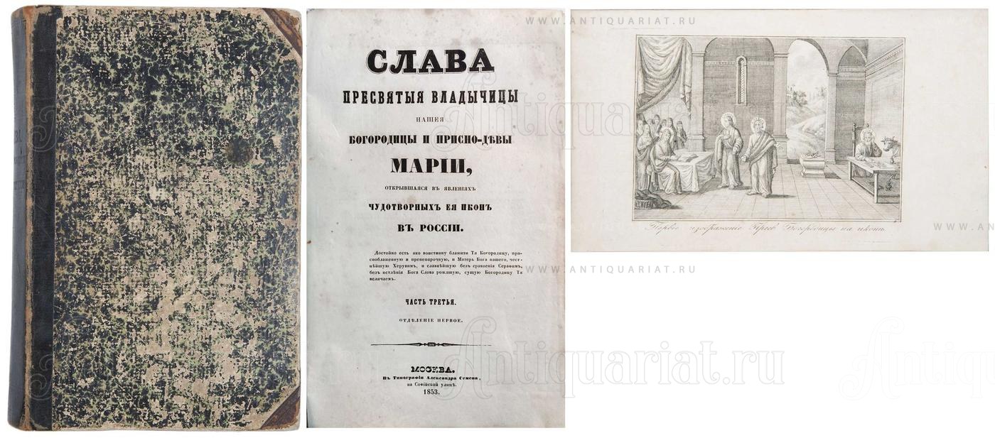 [В 3 ч.]. — М.: в тип. Александра Семена, 1853. Ч. 1. 102, [1] с., 1 л. фронт.; Ч. 2. С. [2], 103-239 с., 1 л. фронт.; Ч. 3. Отд. 1. [2], 130, II с., 1 л. фронт.; Отд. 2. 121, II с.; 3-е. — 1853. — 115, III с.; Переплёт: Изображение икон Пресвятой Богородицы в Православной церкви прославляемых, и с присовокуплением умилительных молений к Божией матери. — 3-е изд. М.: тип. И. Ефимова, 1882.- [2], VI, 70 с.: ил., 1 л.ил.