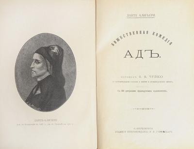[в 3 ч.] / Данте Алигьери; Пер. В.В. Чуйко. — СПб.: В.И. Губинский, [1894]. — Ч. 1: Ад: С 68 рисунками французских художников. — XXIV, 207 с., [1] л. фронт. (ил.), [15] л. ил.: ил.; Ч. 2: Чистилище: С 72 рисунками французских художников. — 224 с., [9] л. ил.: ил.; Ч. 3: Рай: С 74 рисунками французских художников. — [2], IV, 228 с., [11] л. ил.: ил.