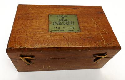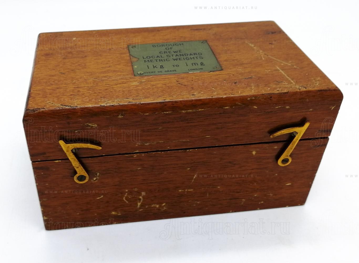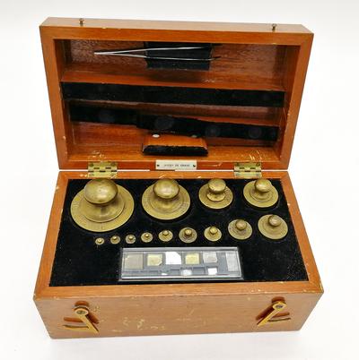 В укладке 13 бронзовых гирь (от 1 кг. до 1 гр.) и набор мелких разновесов (менее 1 гр.) из 9 шт. Футляр для разновесов изготовлен из красного дерева. На футляре имеются царапины (см. фото).