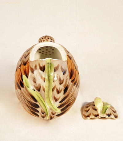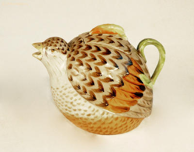 Эффектный заварочный чайник в виде перепелки, со съёмной крышечкой на спине птицы и ручкой в виде стебля растения.