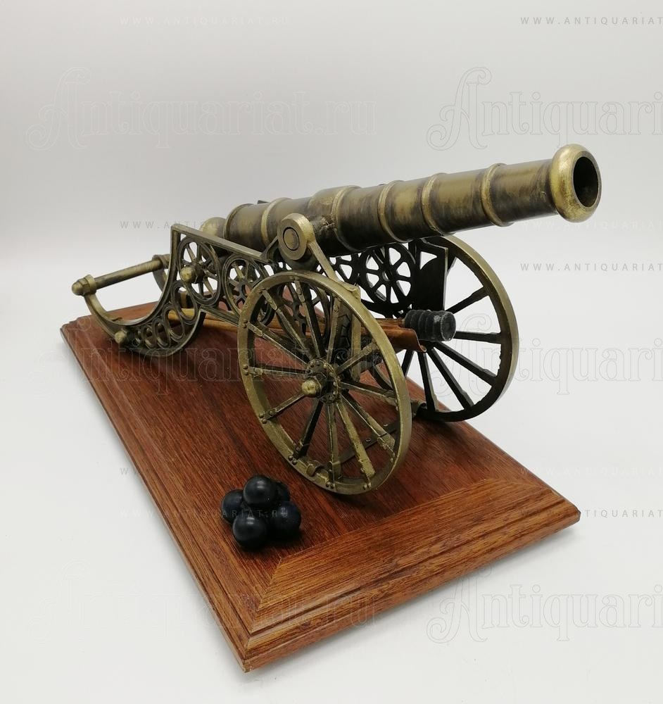 Настольная модель полевой пушки, выполненная из бронзового сплава, вероятнее всего, создана в начале XX века в Западной Европе. Изделие представляет собой декоративную интерпретацию классической полевой артиллерийской установки XVII–XVIII веков. Несмотря на художественные допущения, в конструкции легко угадываются черты настоящего военного орудия: гладкоствольный ствол с кольцевыми утолщениями, деревянные шомполы и лафет с большими колесами.