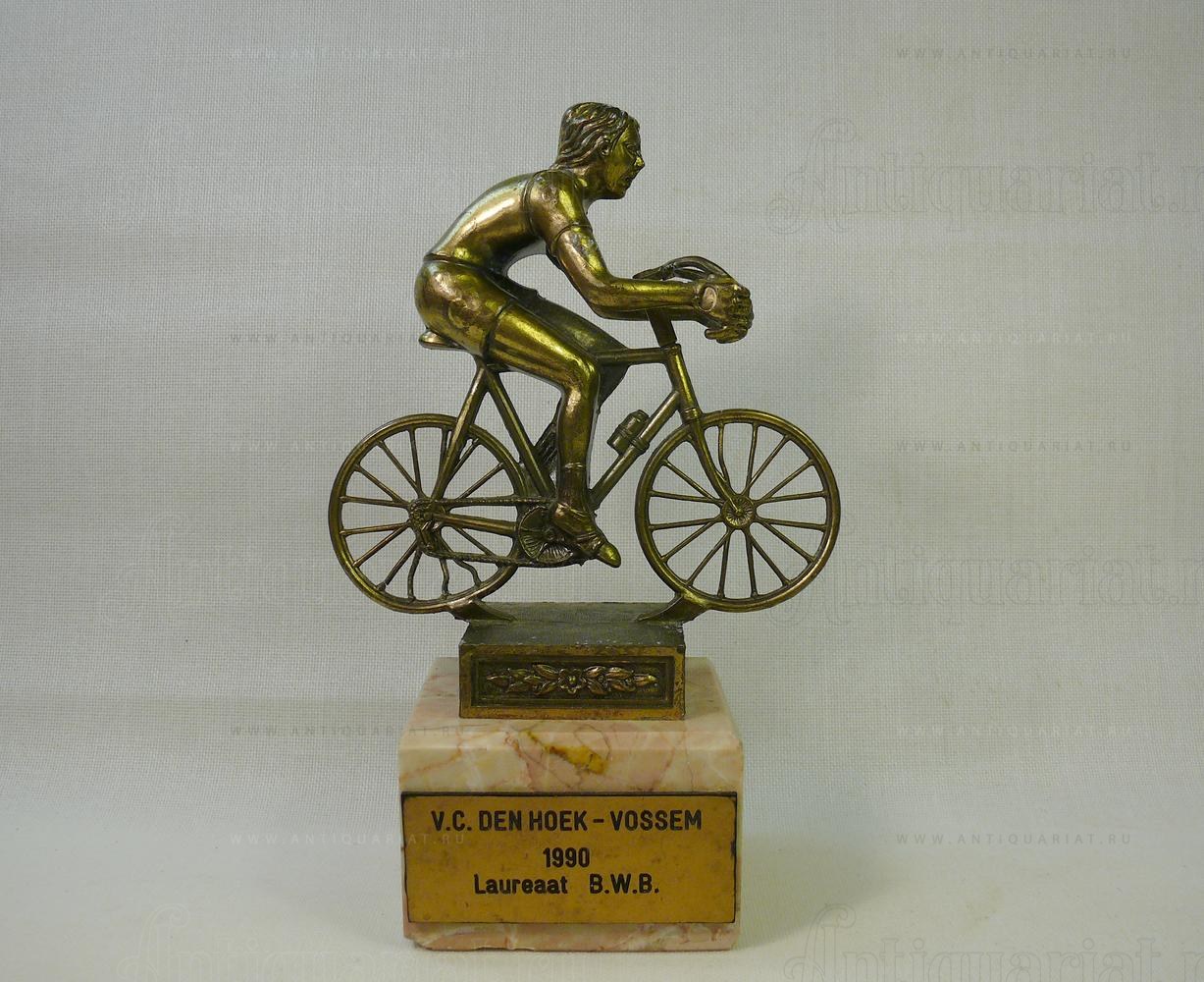 Бронзовая фигурка велосипедиста на каменной подставке с табличкой. Надпись на табличке на фламандском языке: "V. C. Den Hoek - Vossem 1990 Laureaat B. W. B.".
