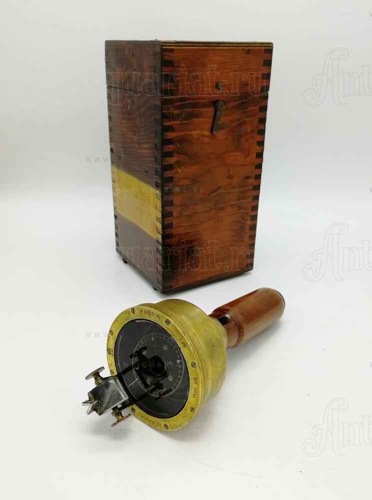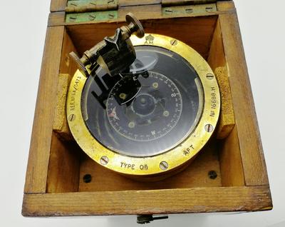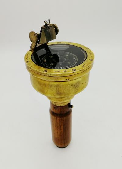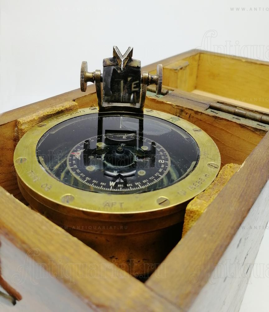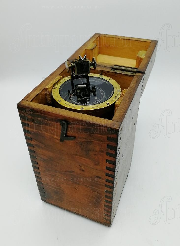 Данный прибор в бронзовом корпусе. Ручка выполнена из красного дерева. В оригинальном футляре и хорошей сохранности. Указаны размеры футляра. На инструменте выгравировано 6A/0473 с Королевской короной и штампом AM. Эти компасы использовались в самолетах британского прибрежного командования Королевских ВВС для определения пеленга с самолета в условиях, когда нельзя было использовать фиксированный тип компаса наблюдателя. В ручке находятся батарейки (не входят в комплект) для питания внутренней лампы, которая должна освещать чашу компаса изнутри. Когда цель пеленга видна через букву «V» на вершине стеклянной призмы, наблюдатель будет считывать направление пеленга через зеркало призмы, когда оно отражается от карты компаса. Отметки на карточке компаса перевернуты, чтобы они правильно отображались в призматическом зеркале.
