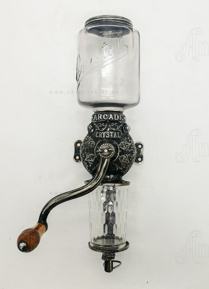 Антикварная настенная кофемолка производства Arcade, модель Crystal No. 3, с надписью «Arcade Crystal» конца 19 века. Рельефный чугунный механизм покрыт оригинальной краской. На банку навинчивается оригинальная жестяная крышка, имеется стеклянный стакан-приемник и пружины, удерживающие его на месте. Коллекционный экземпляр. Редкость.