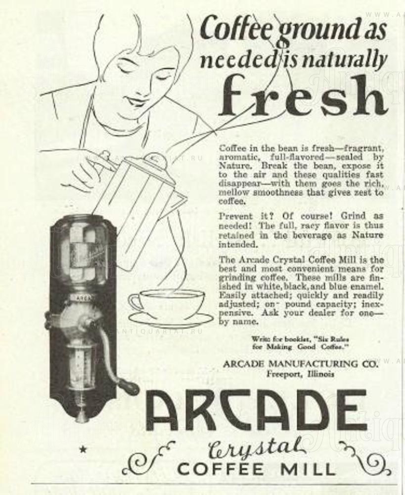 После игрушек другим наиболее востребованным предметом коллекционирования Arcade, вероятно, являются настенные кофемолки канистрового типа. Сама мельница была чугунной, но канистра, в которой хранились кофейные зерна, была сделана из прозрачного стекла. Второй стеклянный контейнер гораздо меньшего размера собирал молотый кофе на дне мельницы.