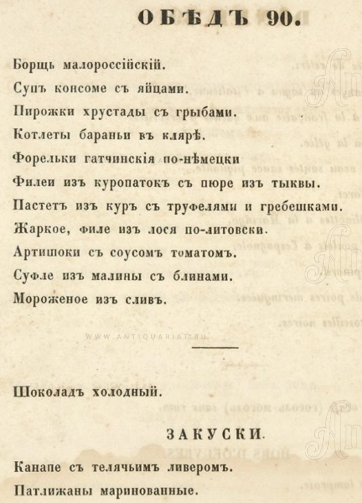 Эскалопы из зайца с лапшою, щука тушеная со сметаной по-сельски, скворцы фаршированные с пикантом, филе из копченого гуся, телятина с вишнями по-венски, вольвант с пульпетами из рябчиков, мороженое из бергамотов, бланкет из цыплят с луковым пюре — эти и огромное количество других рецептов, «упакованных» в тридцать уже составленных меню обедов.