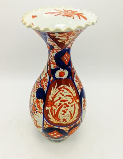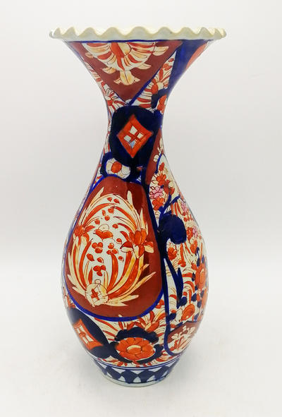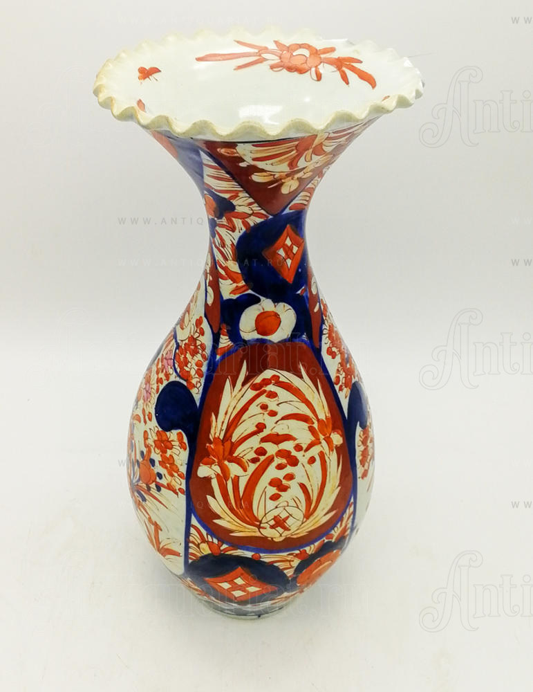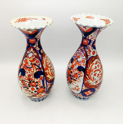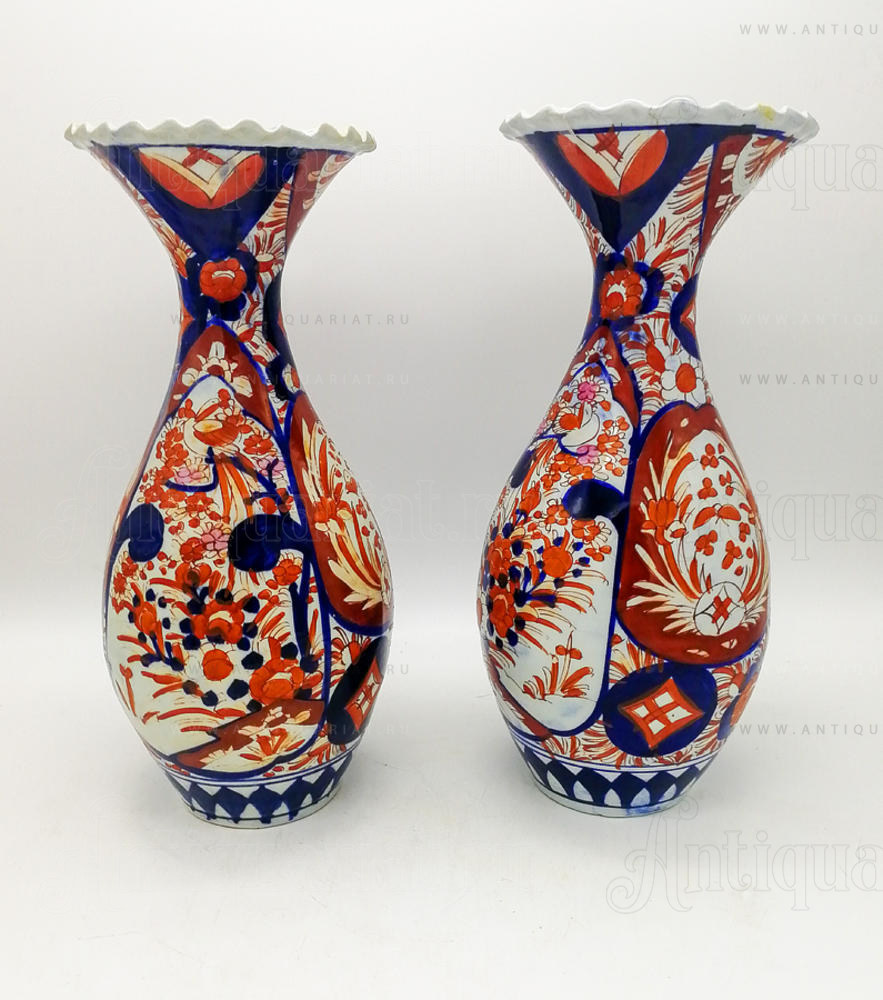 Пара японских вазы Имари периода Мэйдзи. Очень большая пара раскрашенных вручную японских ваз. В декоративном оформлении данных ваз используется растительный орнамент с восточными мотивами. Используется как подглазурная так и надглазурная роспись.