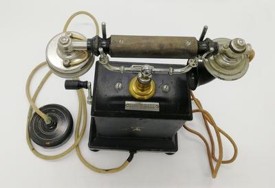 Телефонный аппарат с трёхмагнитным индуктором. Модель 1895 года. Изготовлен в Швеции для Нидерландов.Имеются следы потёртостей характерные возрасту предмета (см. фото).