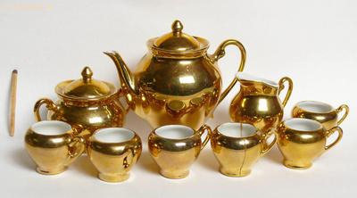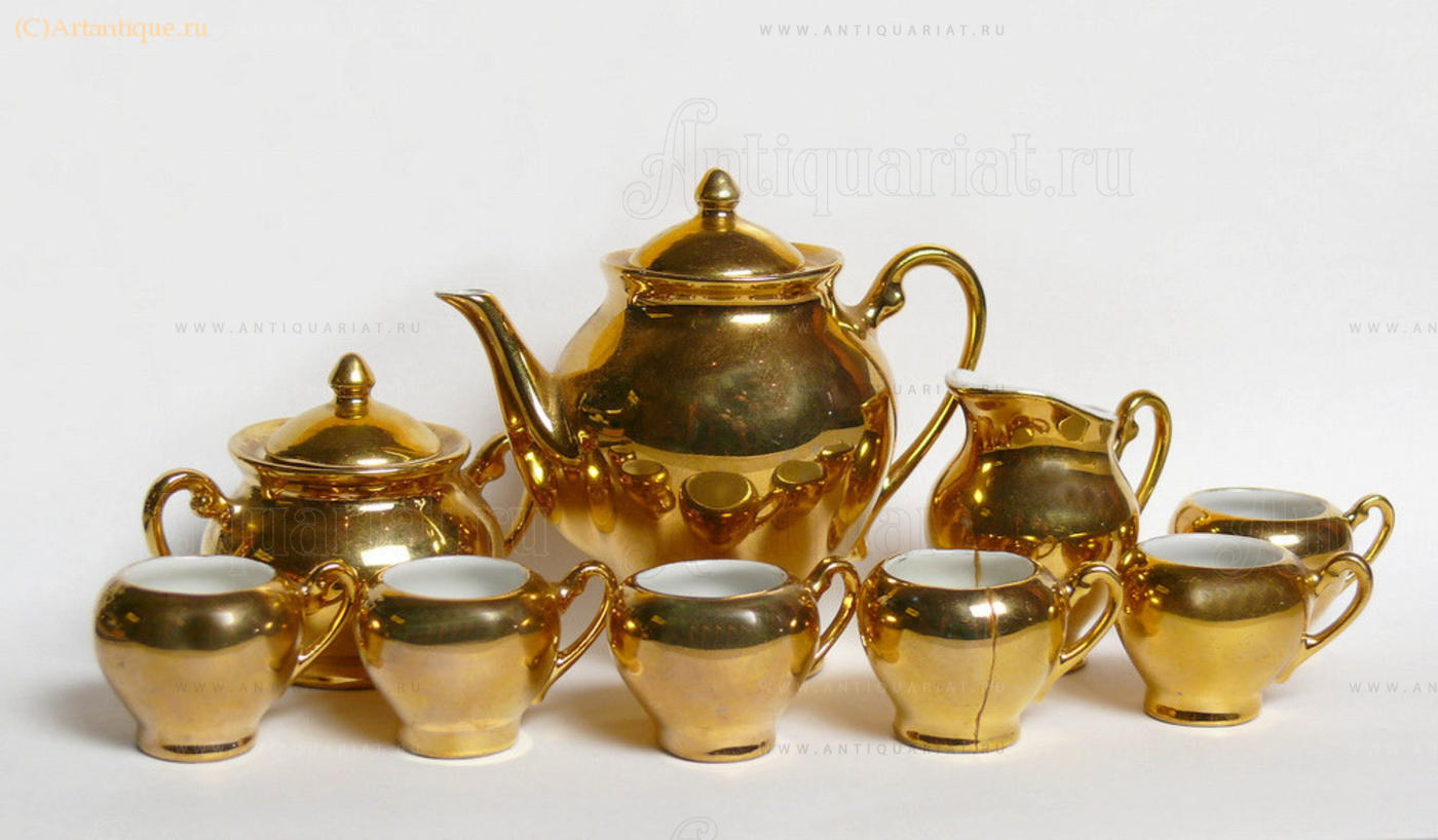 В набор входит 9 предметов: чайник, сахарница, молочник, шесть чашечек.