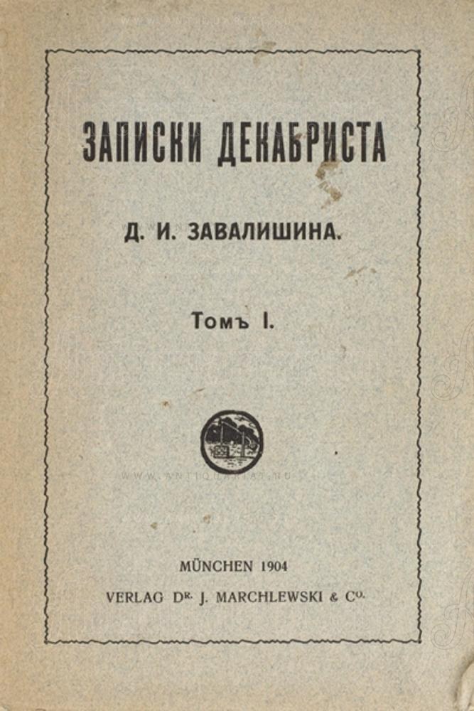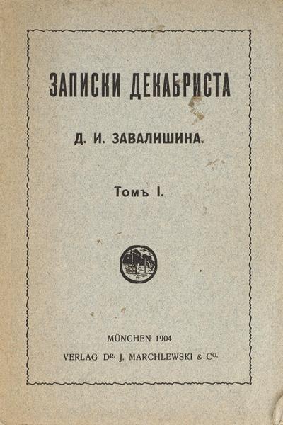 Первое, мюнхенское издание. Издание выпущено в Мюнхене в 1904 году. С двумя портретами автора. В скандальных «Записках декабриста» Д. Завалишина объясняются причины, которые побудили автора принять участие в политическом движении, приведшем к событиям 14-го декабря 1825 года, а также содержится правдивая история и тайных обществ, и «каземата» в Сибири, где содержались главные их участники, и где все происходившее так много способствовало к разъяснению тех идей и побуждений, которые привели к образованию тайных обществ.